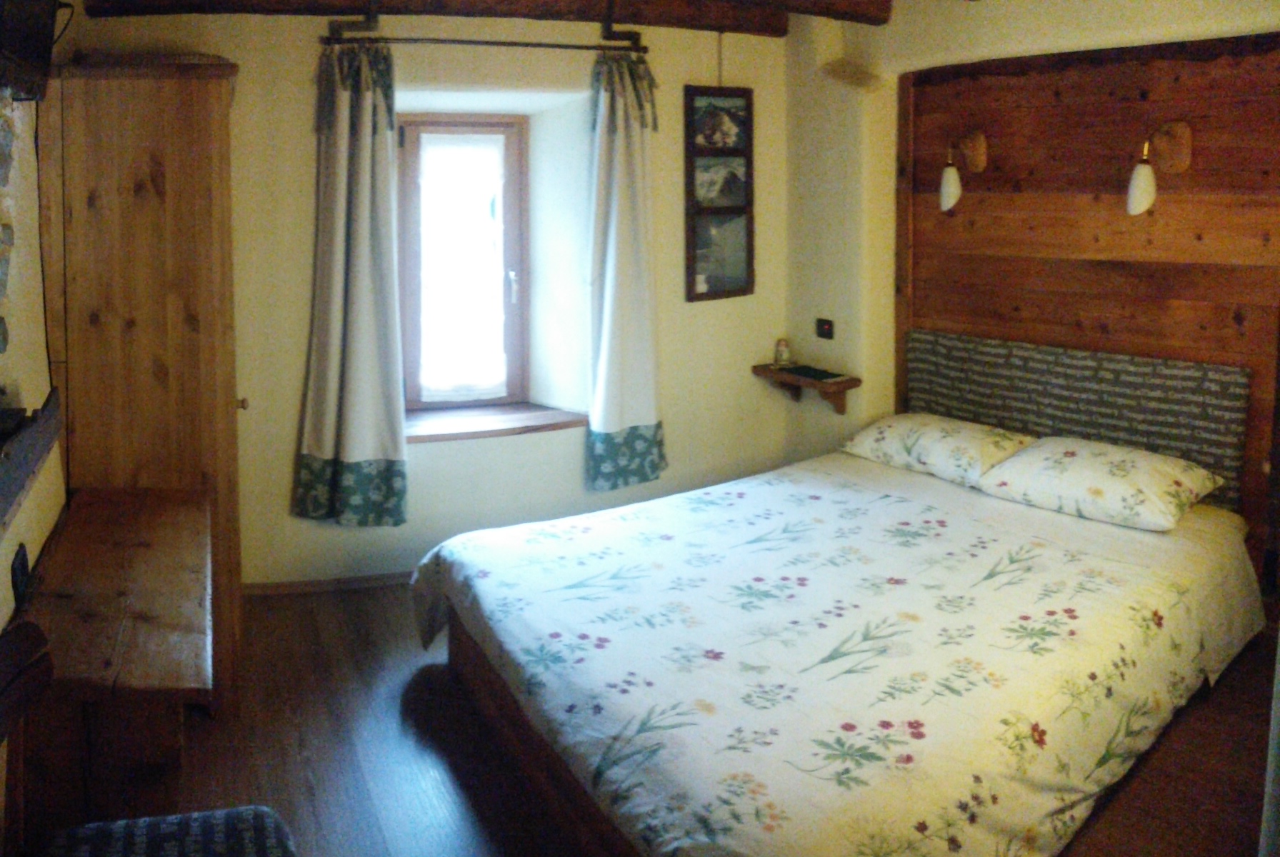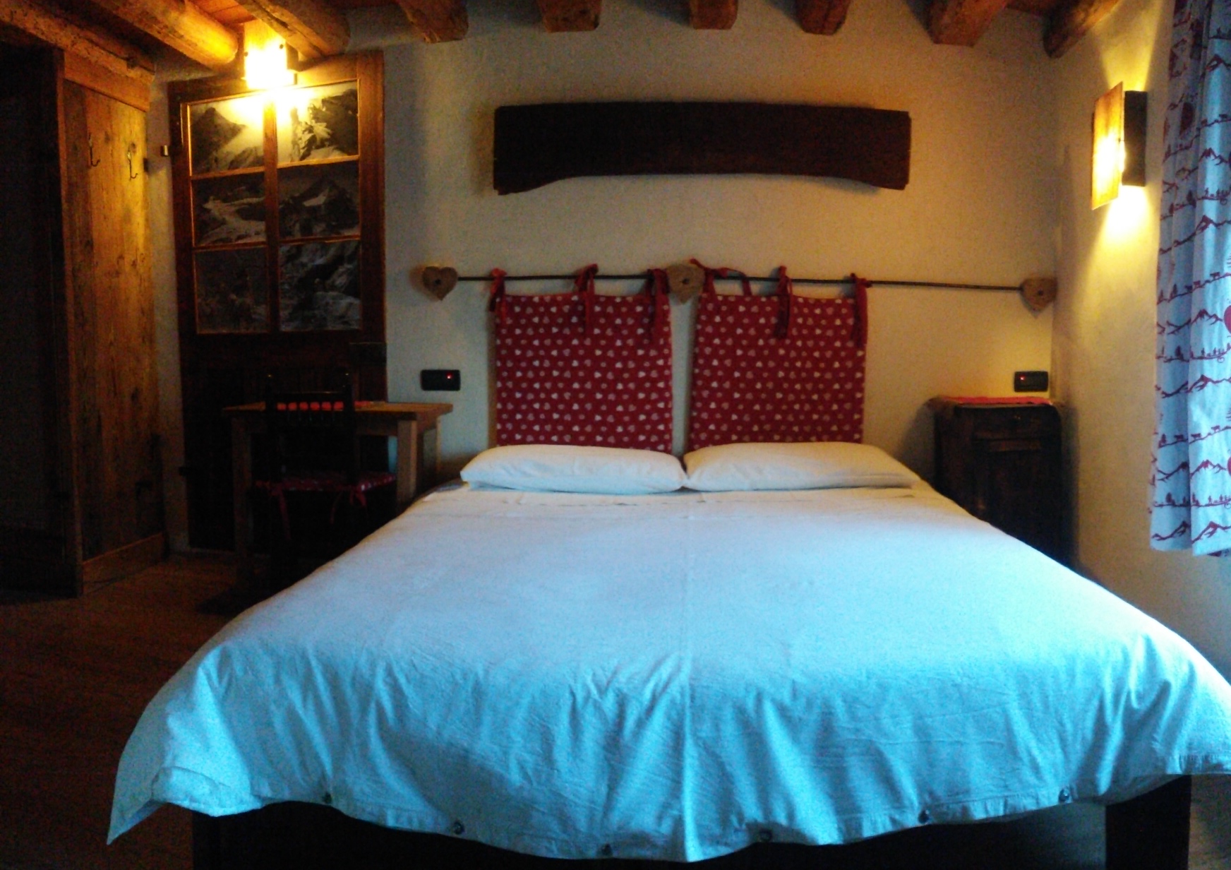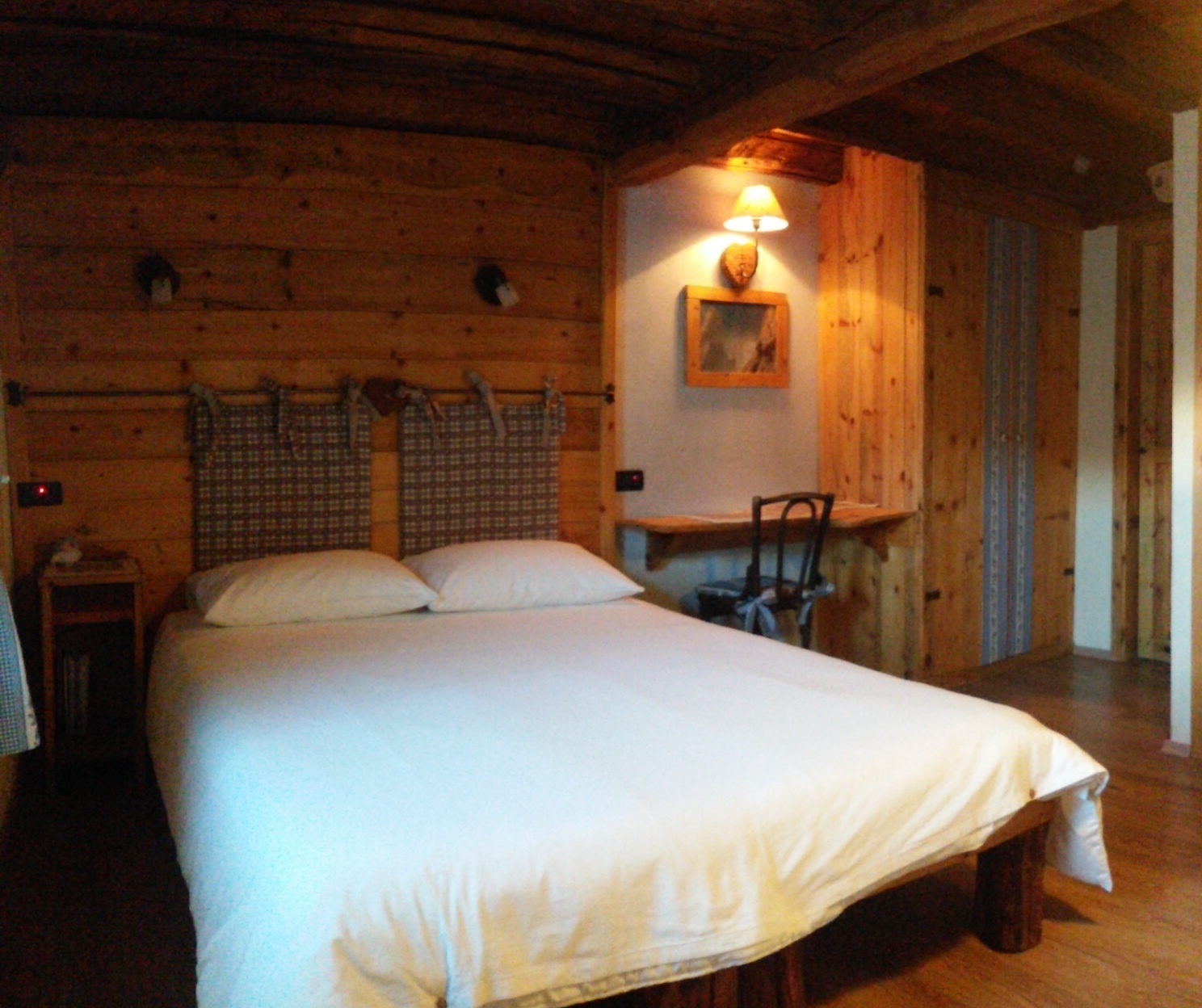 Gli antichi legni del tetto, usati per la boiserie e per il mobilio, abbinati ai tessuti in tinta chiara, caratterizzano questa stanza, dedicata alla montagna più alta delle Alpi, il Monte Bianco, che con i suoi ghiacciai ha creato la Valle d'Aosta.